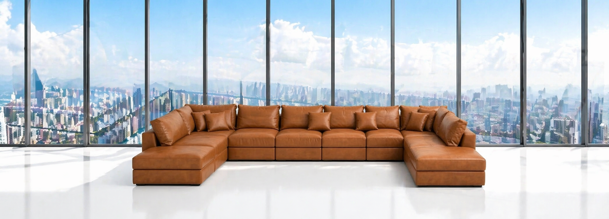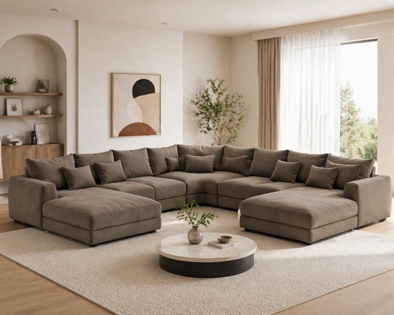 El sofá esquinero, confeccionado en una tela suave y resistente y equipado con múltiples cojines, ofrece una zona de descanso amplia y cómoda, ideal para varias personas en el salón, creando un ambiente cálido y moderno.