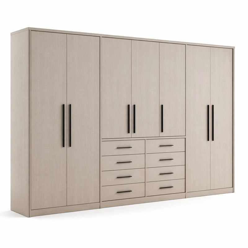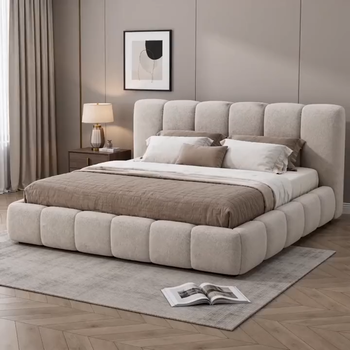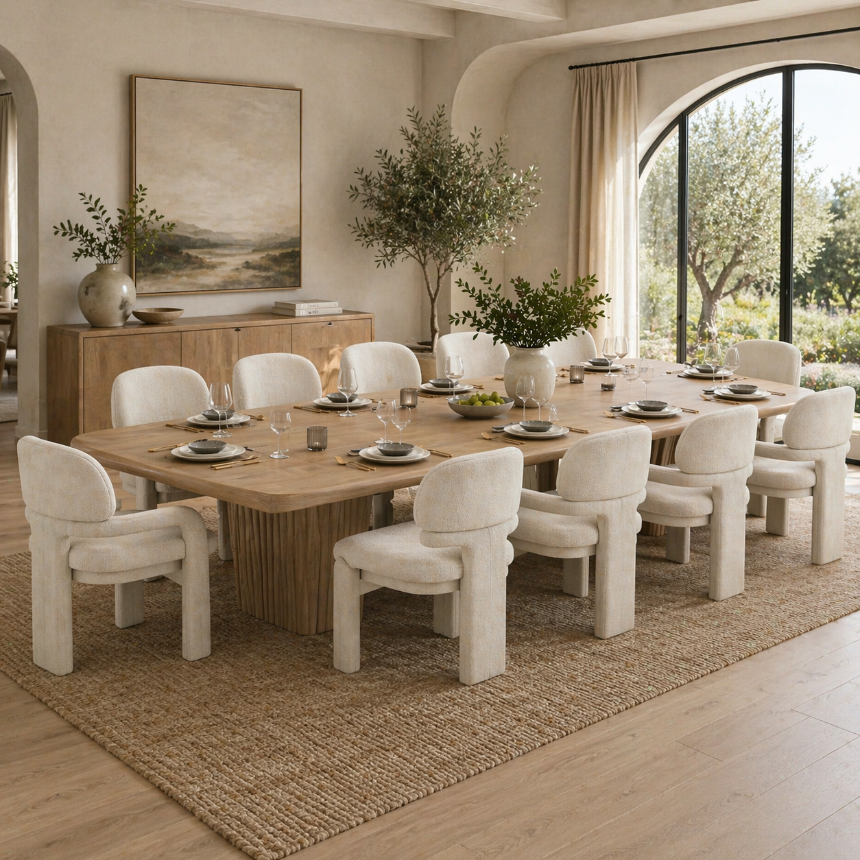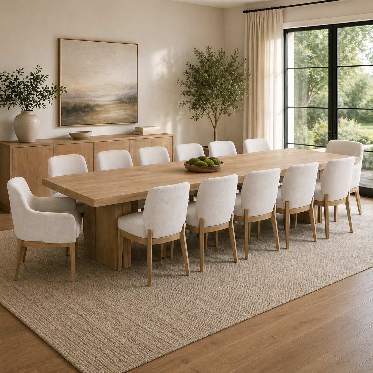 El conjunto de mesa y sillas de comedor consta de una mesa larga de madera maciza y varias sillas tapizadas en color beige. Su diseño es sencillo y elegante, combinando practicidad y estética, ideal para el hogar o reuniones. Ambos muebles comparten un estilo unificado, utilizando tonos neutros y materiales naturales para crear un ambiente armonioso, cálido y moderno.